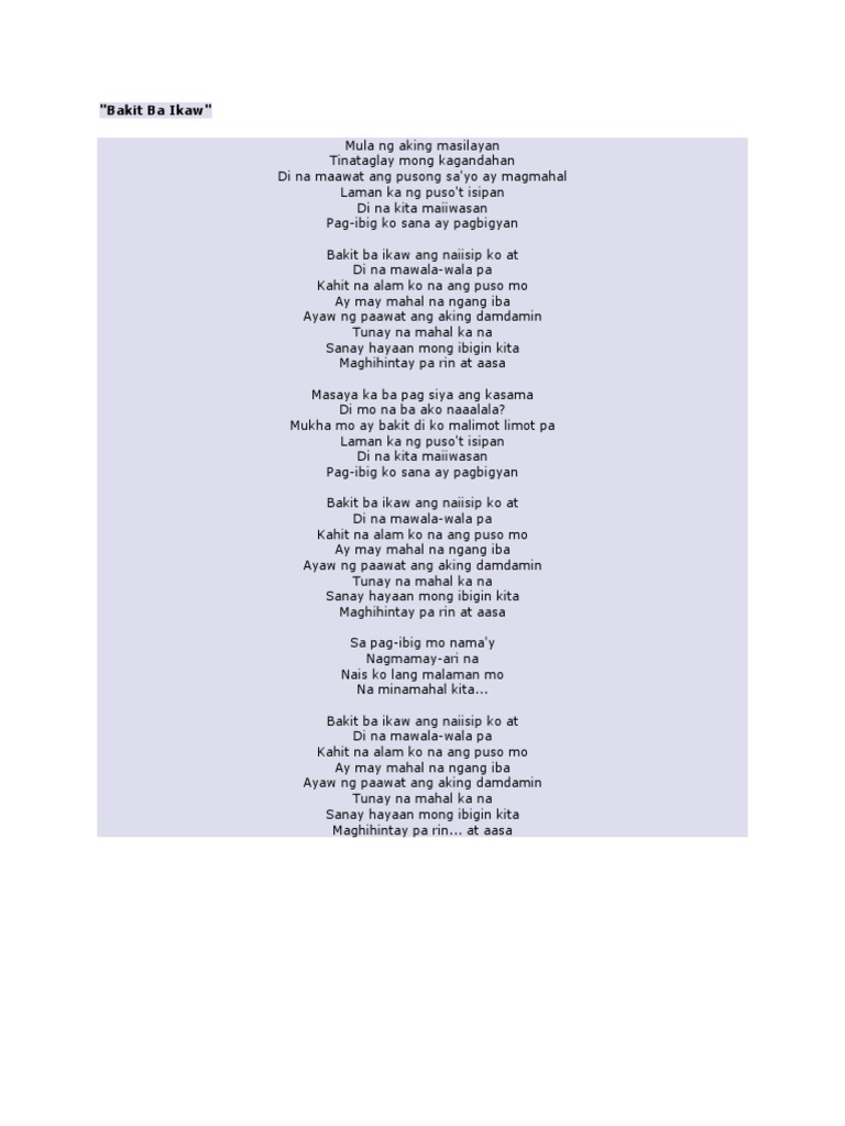 Michael Pangilinan Lyrics Bakit Ba Ikaw bakitbaikawlyrics Mula ng aking masilayan Tinataglay mong kagandahan Di na maawat ang pusong sayo ay magmahal Laman ka ng pusot isipan Di na kita. Chorus bakit ba ikaw ang naiisip ko at di na mawala-wala ka kahit na alam ko na ang puso mo ay may mahal na ngang iba. Sanay hayaan mong ibigin kita.
